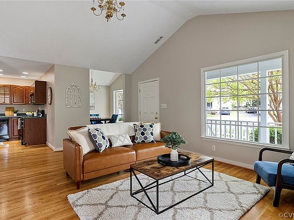 Welcome to your serene sanctuary nestled in the heart of Winchester Green, only 10 minutes from Short Pump. This charming transitional ranch is filled with natural light and boasts soaring cathedral ceilings, gleaming refinished wood floors, and a freshly painted interior. You will feel right at home in the spacious living room featuring a double-sided fireplace. The sunroom is bathed in natural light and is the perfect place to enjoy a morning coffee. Entertain in style in the formal dining room, where a stunning bay window provides a scenic backdrop for memorable celebrations. The primary bedroom features a cathedral ceiling and generous closet space, as well as an updated ensuite bathroom. The second bedroom has lovely natural light and direct access to the deck. The main bath has classic black and white floor tiles and a white tiled tub/shower. Step outside to discover your own private oasis where you can enjoy the deck or patio to soak up the sunshine or simply enjoy the gentle stillness of the small pond. Sit on the spacious front porch to greet neighbors and friends and enjoy the quiet cul-de-sac. Located in sought-after Winchester Green, you will enjoy limited lawn care and easy access to shopping, dining, entertainment, and top-rated schools. This home offers the perfect balance of suburban serenity and convenience. A stair-free entrance is provided by the wide ramp from the driveway to the front porch. The seller will remove it if desired by the purchaser.