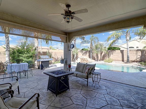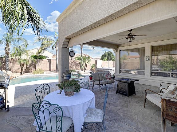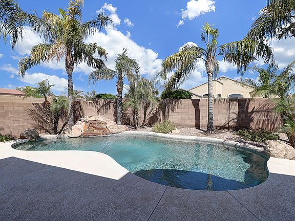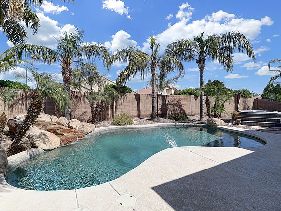 This stunning Litchfield Park home has so much to offer, welcomed by regal porte cochere entrance with additional parking and courtyard area. Out back you will find gorgeous mature queen palms swaying above a sparkling lagoon pebble-tec pool with rock water fall feature to keep you cool all summer. An extend patio living area to give plenty of space for entertaining and dining al fresco. Or you can take a relaxing dip in your built in hot tub. Inside you will find a cooks delight kitchen, with upgraded warm cherry wood 42'' cabinets, granite counter tops and stainless steel appliances. Breakfast nook and eat at island, corner walk in pantry. Family room is off the kitchen and features room of ample seating, wall unit/desk is custom made for the space, however easily removed. more.. Guest powder room downstairs. Dedicated Laundry room with space for mudroom bench or additional freezer. Journey upstairs and you will find 3 oversized bedrooms and a loft. Bath 2 features a door in between the toilet/tub and sink. Elegant double door rotunda entrance into the master suite where you will find a large walk-in closet & Master bath features double sinks, vanity, garden tub and walk in shower. 3 car garage, complete with electric door opener and deep sink. Water softener and RO at kitchen sink. Solar savings, low payments of only $98 per month. All this with great schools and lots of nearby shopping. Close to Westgate, 101 and I10. This home is eligible for Zero Lender Fees, Plus $1,000 Toward 3rd Party Costs* Plus Low, Low Rate, be sure to inquiry about loan savings!!