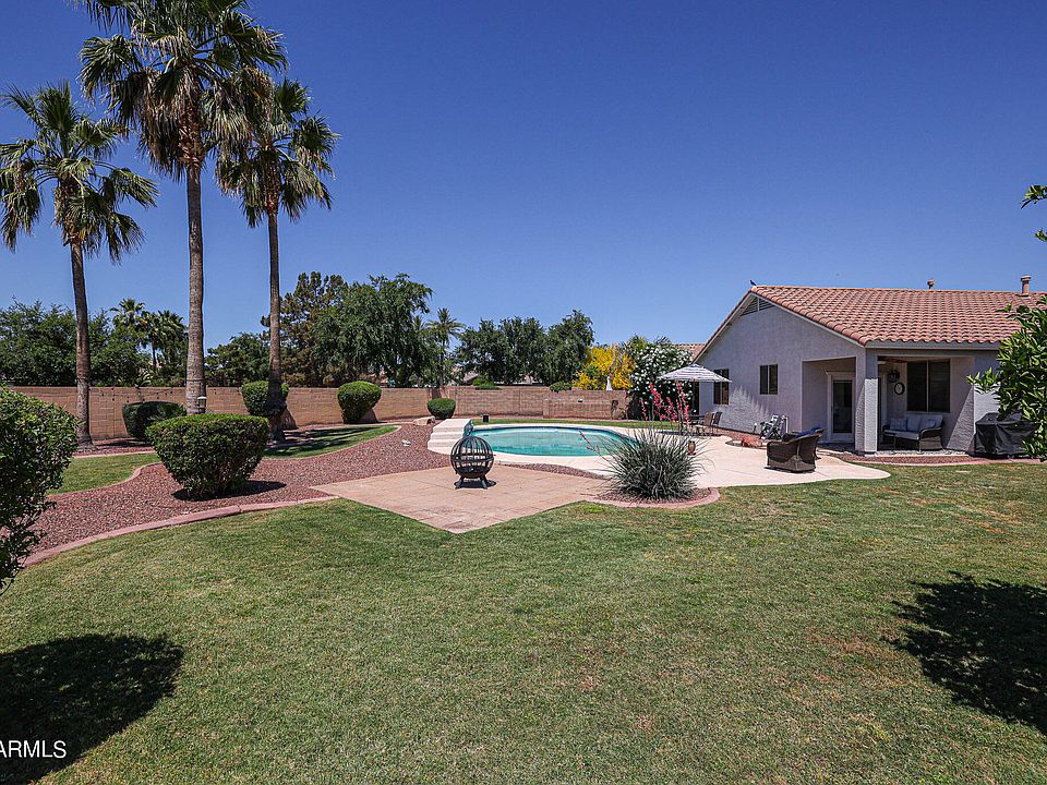 Welcome to this meticulously maintained home offering you the best of comfort and luxury with a Mother-in-law suite! As you enter this home, you will be greeted by a spacious and open floor plan that is filled with natural light. The living area features high ceilings, elegant finishes, and a cozy fireplace, creating a warm and inviting atmosphere. The completely remodeled gourmet kitchen is a chef's dream, boasting quartz countertops, stainless steel appliances and ample cabinet space. It is the ideal space for preparing culinary masterpieces and entertaining guests. Stay cool in the hot summer months with a brand-new A/C unit and a new mini split in garage. The primary bedroom is a true retreat, complete with a private en-suite bathroom featuring a soaking tub, separate shower, and a dual sink vanity. The additional bedrooms are generously sized and offer plenty of space for rest and relaxation. Step outside to your own private oasis on over a 12,000 sq ft lot, where you will find a beautifully landscaped backyard with a covered patio, perfect for enjoying the Arizona sunshine. Whether you prefer to relax by the pool, host a BBQ, or simply unwind in the tranquil surroundings, this backyard has it all.