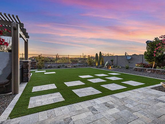 Stunning home on premium lot with panoramic desert mountain views. This 2019 built home offers 3 beds and 3 full baths. The third car garage option was built as a den and ensuite and offers a split private area for guests. The designer touches can be seen throughout the home and include wood beams, a brick feature wall, beautiful open kitchen with premium quartz countertops and a gas fireplace with marble surround. The real showstopper is the professionally landscaped yard that features a raised seating area with fire pots for desert wash and mountain viewing, 4-person spa with gazebo, artificial grass, extended travertine patio with solid roof gazebo and remote controlled solar shade, built-in BBQ grill, lush plants, trees and a cactus garden with 2 saguaros! This is a must see!