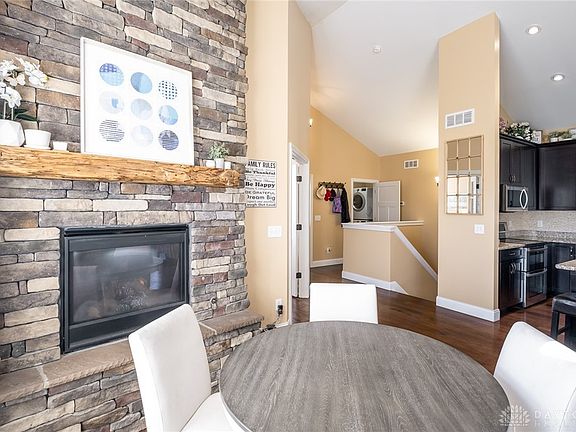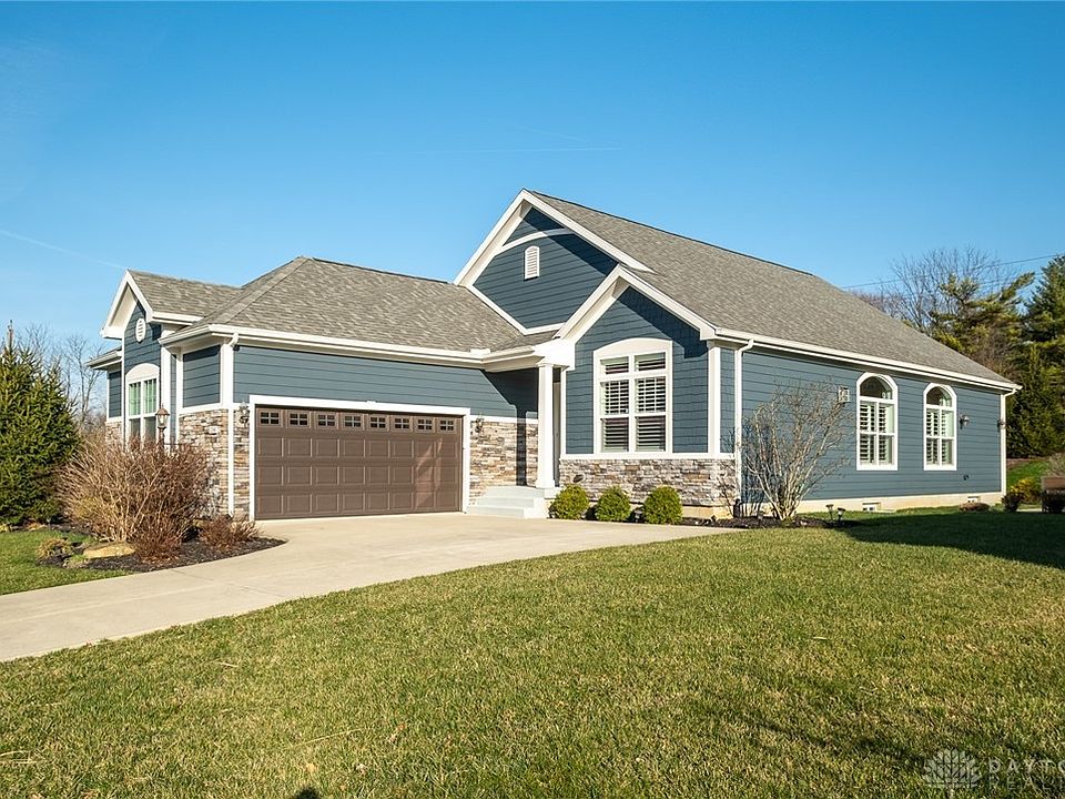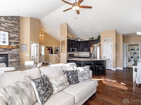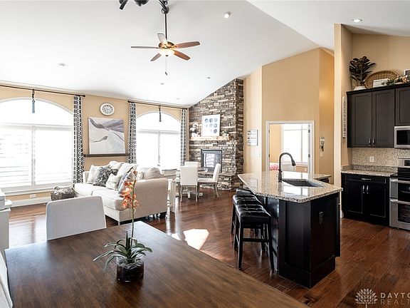 Prepare to fall in love! This Sugar Ridge ranch with finished basement offers high-end finishes and is deceptively spacious with over 3300 sq ft of living area! The modern floorplan features cathedral ceilings, plantation shutters, and wide plank hardwood floors throughout the living areas! The inviting great room (currently used for both living and dining) boasts a floor-to-ceiling stone fireplace! For the cook, the kitchen features granite counters, an island with bar seating, and stainless appliances. You’ll appreciate the main level primary bedroom with tray ceiling, expansive closet with access to the laundry room, and ensuite bath complete with a walk-in-tile shower and dual vanity. Three additional bedrooms and a full bath complete the first floor. Head to the basement for a rec room, kitchenette with island, two offices, and full bath – all finished to the level of the upstairs! Outside, enjoy the covered patio accessible from the breakfast area or the secondary patio! House was completely re-sided in 2022!