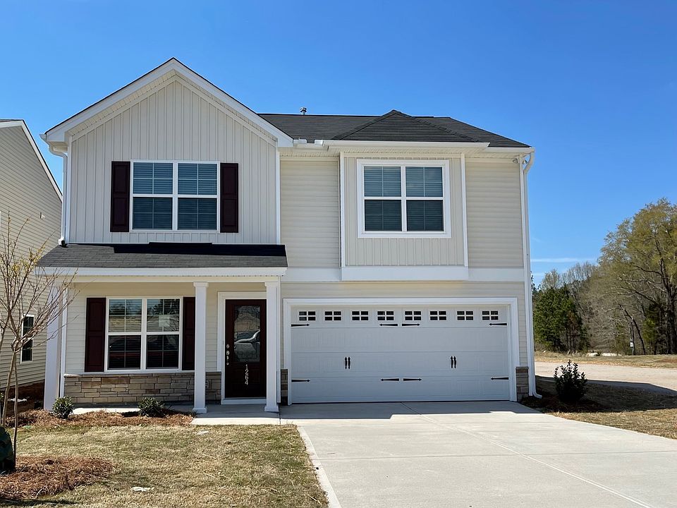 This two-story Guilford home has four bedrooms and two-and-one-half bathrooms. Luxury vinyl flooring runs throughout the downstairs living spaces which makes cleaning and upkeep a breeze! The kitchen is open to the family room and features stainless steel appliances and granite countertops with an overhang that allows for extra seating. The primary suite is located upstairs and includes a vaulted ceiling that expands the space even more! A separate tub and shower can be found in the primary bathroom, double bowl vanity, and large walk-in closet. Three more bedrooms, a full bath, and laundry room complete the second floor. Outside you will find a covered porch and patio space that is great for entertaining and relaxing while soaking in those beautiful Carolina nights! Enjoy the view of trees in the backyard. Don't wait--call for more information on the Guilford today!