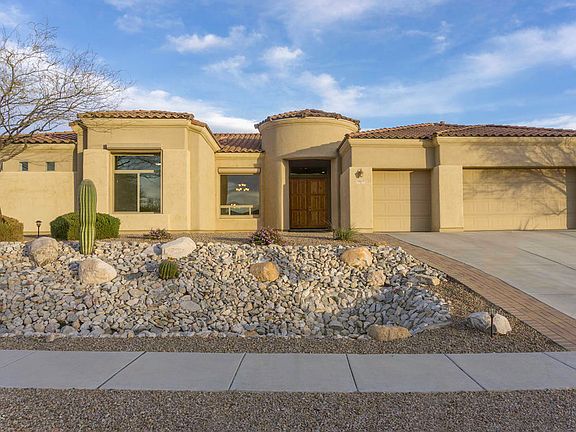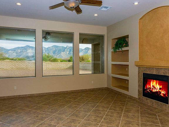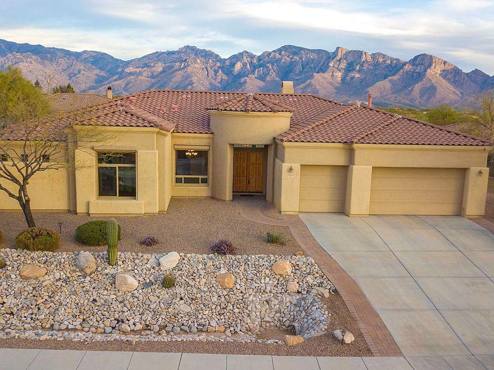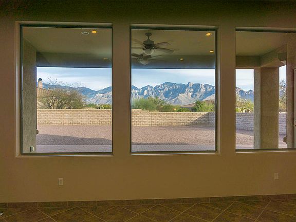 Views...with a beautiful home! 3-bedroom plus den 'Sterling' home sits on the finest mountain view lot in this elegant subdivision. Split bedroom plan, big, flowing rooms, home theater set-up off the kitchen, Jack-and-Jill bathroom, large patio/paver living space out back opens into a large yard that is yours to sculpt, plant, or add a pool to soak-in those awesome views of the Catalinas. Automatic, rolling shutters throughout home. Good as new, and move-in ready!