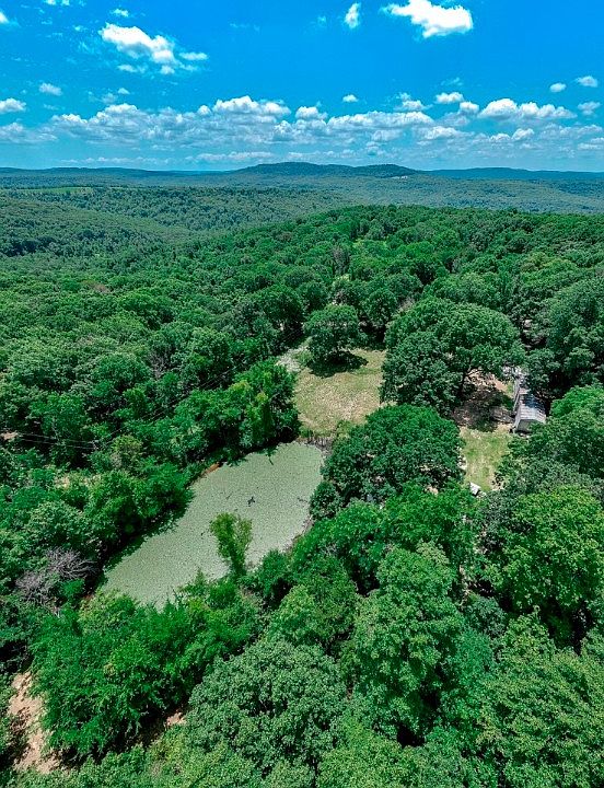 Mountain top 7 wooded acres has the view potential you are seeking at 1850’ elevation. Fronting Green Plastic Road, existing improvements include a large stocked pond with channel catfish, brim and bass. A camping cabin-storage building currently overlooks the pond. Manufactured home does Not have permanent foundation and tongue is in place. (Seller will NOT move the manufactured home.) Invest in your future building site while benefiting from potential rental income. 2 Hr. Notice required for touring manufactured home only. Possession of M. Home as per order, to be midnight on closing day. Total electric with Ozarks Go Internet and public water.