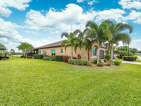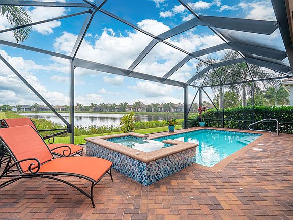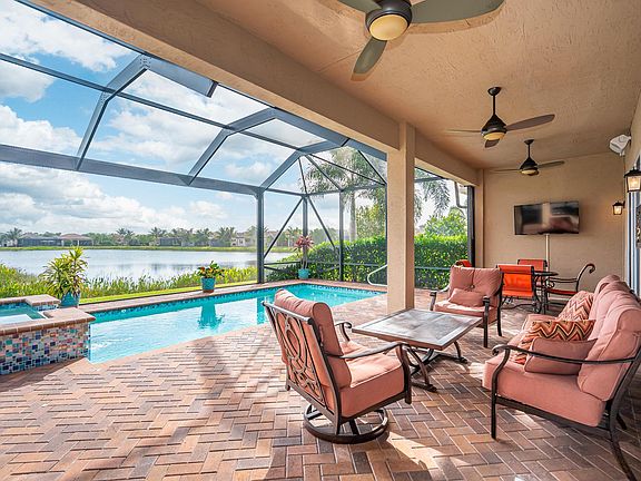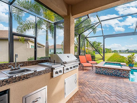 Spectacular rarely available well appointed home complete with Heated Pool/Spa, & impact glass on oversized Fabulous wide waterfront lot with upgrades GALORE! Move right in to this 3 year new home with open plan & over $200K in upgrades! Sellers loss is your gain. Enjoy your own heated salt water pool & spa from oversized extended covered patio & enclosure. Perfect for entertaining, complete with summer kitchen, outdoor shower, wine cooler, custom built in office & entertainment center, crown molding, custom fitted closets, custom spa shower with full body jets, epoxy coated garage floor & storage loft. Enjoy the best of the newly completed Valencia Bay with state of the art clubhouse, fitness, tennis, pickleball, bocce, Flakowitz cafe, bar, pool, clubs & more. 3rd bed/den has no close