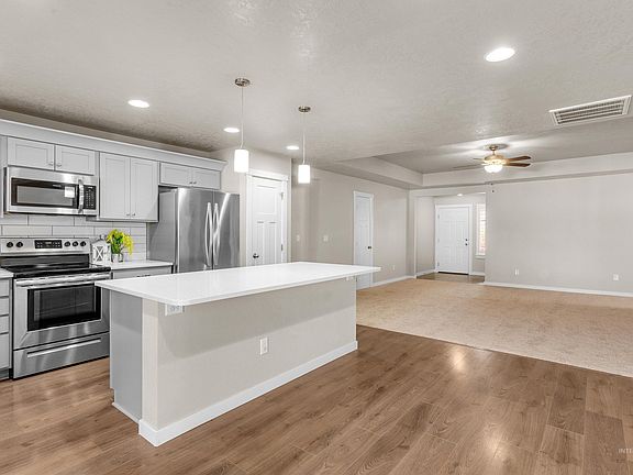 Don't miss out on this great opportunity to own a single-level, open-floorplan home on a large lot just minutes from Boise. Features 3 bedrooms & 2 baths with upgrades throughout, including split-bedroom design, quartz counter tops in kitchen, under-counter lighting, stainless steel appliances, island, large great room, and plantation shutters throughout. The backyard is very large and fully fenced with garden beds and fruit trees (apple, apricot, and peach). To top it off, there is a 15'x40' covered back patio for easy entertaining during the summer. Main-level master bedroom with walk-in closet. Built-in coat and shoe rack next to the laundry room. Biking distance to rapidly growing downtown Star, boasting shops, restaurants, and services, including Albertson's and Starbucks. New carpet and pad installed 11/14/22.