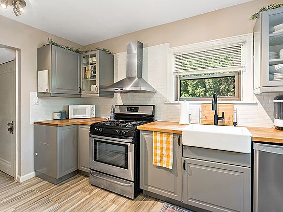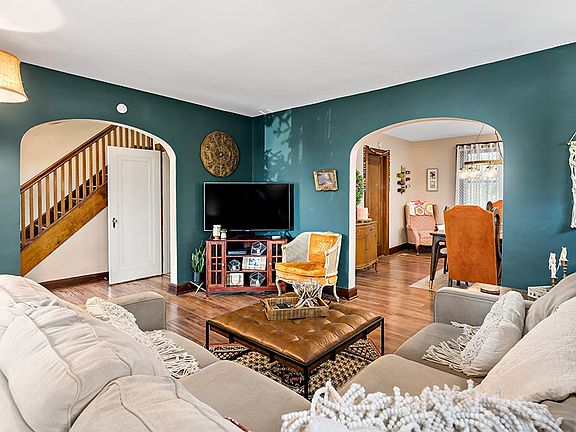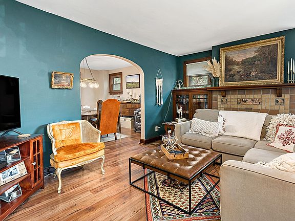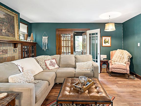 Charming home w/tons of updates throughout, a true mixture of classic & modern touches. Situated on a semi wooded lot, this house offers so much. A beautiful living rm w/french doors leading to tiled sunroom and a curved arch way open to formal dining room, provides plenty of space to entertain. Fireplace feature in the living rm is flanked by built in book cases & picture windows. Hardwood flooring throughout the main level. Updated kitchen provides, sleek gray cabinets w/butcher block countertops, stainless steel appliances, classic subway tile backsplash & deep farmhouse sink. Upstairs find continued hardwood floors and trim throughout. Large master, two additional rooms and full bathroom complete this level. Basement provides a large space to use as desired w/electric fire place, vinyl flooring, recessed lighting & second full bathroom. Laundry rm & storage space in lower level also. Outside find your own oasis with a beautiful deck to enjoy, treelined yard and detached garage.
