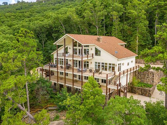 SPECTACULAR 12.43 Acre Greers Ferry Lake Front Estate privately located at the end of the road behind a gate! This 7,798 sq. ft., 5 bed, 5.5 bath mansion also has 3,845 sq. ft. of porches/patios overlooking the 700 feet of lake frontage, showcasing the stunning 180 degree views of Greers Ferry Lake. Inside, the home boasts 4 stories, a professional kitchen large enough to handle the largest groups, 4 different living areas, a towering rock fireplace, a wine cellar and much more! Each bedroom has its own en-suite, but the luxurious main suite is not to be out done! Four of the bedrooms have lake front views & access to the various decks. This home was built for entertaining & the owners would consider selling it furnished. It's currently being used as a seasonal VRBO.