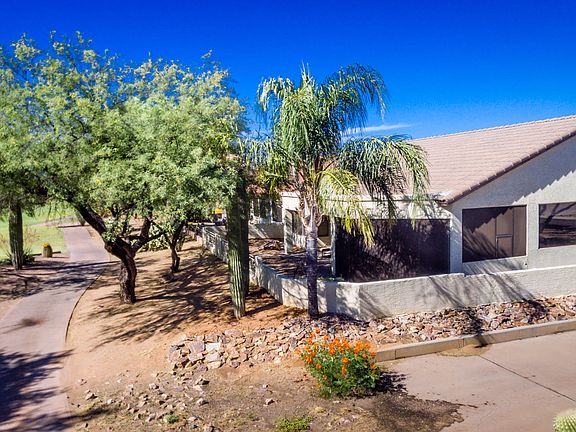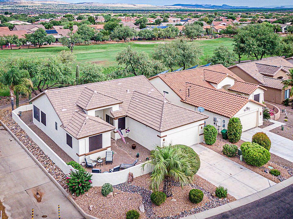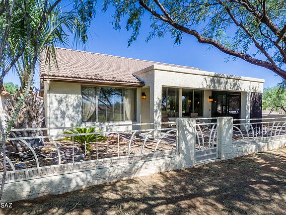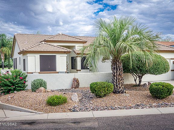 Truly a unique, semi-custom home in Quail Creek located on the golf course looking out over the green of the Quail Course first hole. Details include raised ceilings, larger and more windows than the standard Oakmont model letting the outside in, travertine tile and sculpted carpet, granite counter tops, stylized light fixtures and sconces. Expanded space in the kitchen with built in desk and additional storage, main bedroom has a bay window. Main bath is customized with a corner shower, dual executive height vanities finished with granite tops. You will love the indoor/outdoor enclosed patio entered through the french doors (there is even a pet door), a gas fireplace will warm those cool evenings. For those sunny days, a remote operated screen helps keep the great room cool without