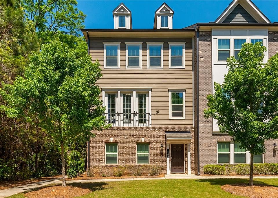 Welcome to Concord Trails in the highly sought after Cobb school district! This beautiful 4 bedroom, 3.5 bath end unit, townhome is situated on a quiet cul-de-sac. As you enter the home, you are greeted by a spacious foyer with mudroom. To the left is a sizable full bedroom with en suite bath. Upstairs, the open concept floorplan boasts a spacious kitchen with stainless steel appliances, granite countertops, large island, pendant lighting, breakfast bar, and breakfast area. This overlooks the cozy family room with large windows that provides ample natural lighting. A powder room is just a few steps up from the family room. The third floor boasts a spacious primary suite with luxury bathroom complete with stained cabinets, tile floor, and large, custom-built, walk in closet. Also upstairs are two oversized secondary bedrooms and a full bath. Completing the upstair is a laundry closet. Outside boasts a balcony and deck. This home has easy access to the East-West Connector, I-285, and Vinings and is located close to local shopping and dining.