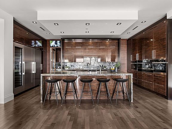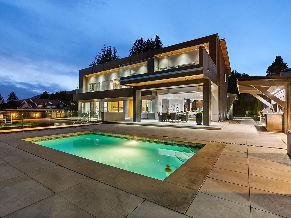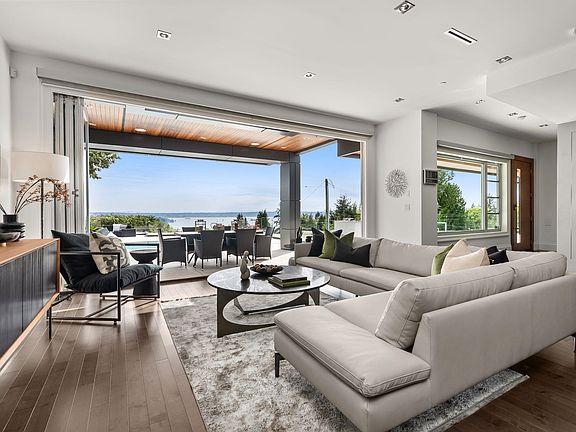 Perfectly perched above the coastline with fast access to Hwy 1, this modern 7,500+ sq ft West Vancouver estate delivers sweeping ocean views from Lions Gate Bridge to UBC and Vancouver Island. Completed in 2020, it offers a chef's kitchen with Miele appliances, a full spice kitchen with Wolf range, granite island, built-in coffee station, Control4 smart system, AC, radiant infloor heating, and an elevator. Outdoor living shines with expansive decks, a sleek pool, and low-maintenance landscaping. The home includes up to 7 bedrooms and 8 bathrooms, a spa-inspired primary suite, gym, sauna, steam room, wine room, legal suite, and a media lounge with movie room and games area, creating an exceptional place to call home.