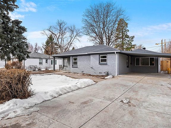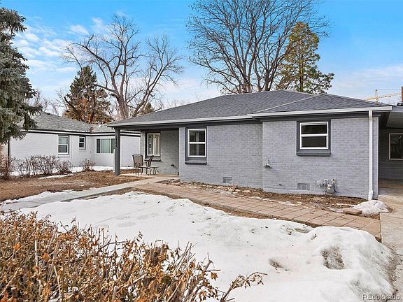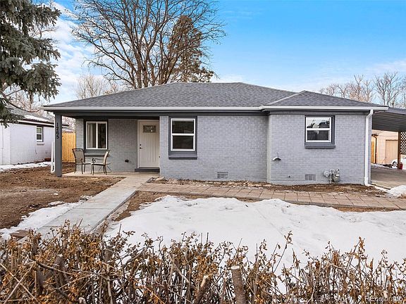 Imagine coming home to this beautiful, sundrenched, top to bottom remodeled classic brick ranch home. This gorgeous home has all the desired details. Upon entering this home, you will immediately notice the quality and details. Walking in you are greeted by the large living room with gleaming hardwood floors. Amenities include a large dining area, massive cook’s kitchen boasting white cabinets, large eating island and gas cooktop. Be sure you check out the front of the island! Kitchen accentuated with stainless steel appliances, solid slab quartz countertops, glass tiled backsplash are just a few of the features. The new windows including new window coverings, French doors with built in window coverings open to a concrete patio with a massive backyard outfitted with large mature trees. A primary suite contains a spacious closet and sparkling new bathroom. Two additional bedrooms and a renovated, full bathroom are more of the home details. Large spacious tiled laundry room is an additional benefit. Each day will be a like waking up to clean fresh breath. You’ll notice from the curb a new concrete walkway and driveway slab. No details have been missed. Within walking distance to light rail or a quick 17-minute drive to 16th St Mall or to Cherry Creek mall. Very close is the new Casa Bonita and a drive to the mountains make this a prime location.