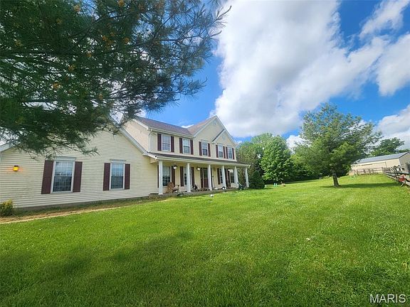 Large two story home on 9.16 acres on blacktop State Hwy M and fenced for your horses/cattle! Plenty of room for them to roam the range plus has 2 stall horse barn with electric and water plus a chicken coop wired for electric-fenced pasture has some electric, barb wire and board fencing plus an automatic waterer which uses ground heat-the home has 4 bedrooms, 2 1/2 baths,living room with fireplace, formal separate dining and an office/sitting room all tied together with a T staircase. there is some black walnut wood floors, also master bath has dual sinks, jet tub and separate shower plus an upstairs laundry-dual furnace and a/c-above ground pool (needs new liner) plus a deck- home is need of work and is being sold as is!