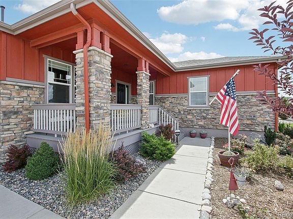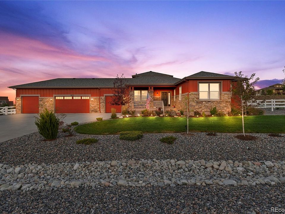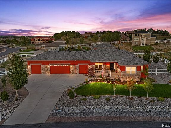 This beautifully maintained 4-bed, 3.5-bath raised ranch rests on a prized 1.6-acre corner lot in Riverdale Peaks II. Sun-soaked, open-concept interiors feature soaring ceilings, walls of windows, hardwood floors, and a gourmet Jenn-Air kitchen with granite, large island, and window-wrapped breakfast nook. Off the mudroom, a walk-in pantry flaunts an etched-glass barn door, built-ins, and bench cubbies. Recent mechanicals include new garbage disposal and sump pump. The luxury primary retreat provides a walk-in closet, dual vanities, soaking tub, and 5-ft shower; three additional bedrooms, a main-floor office, and formal dining room meet every need. A fully finished basement flexes as rec room, gym, or theater. Outside, enjoy mature oak, maple, and Spartan evergreens, a full sprinkler system with expansion stubs, and an expansive raised-bed garden plus producing apple, peach, and pear trees. Entertain on the 25x20 composite deck with dusk lighting or beneath the covered patio wired for sound and cooled by a ceiling fan. HOA allows an RV garage, and a fenced, turfed dog run keeps pups happy. Oversized four-car garage shelters vehicles and gear. Flat yard still offers space for sport court, pool, or play set. Minutes to parks, trails, top schools, shopping, golf, and major highways this turnkey estate pairs acreage, luxury, and convenience. Landscaped beds burst with color each spring, gravel paths lead to a quiet seating grove for sunrise coffee, and a full fence still feels boundless thanks to sweeping lawn and Front Range views. Upgrades include Cat-6 wiring, and programmable thermostat and irrigation. Double-pane windows & extra insulation. Host barbecues, enjoy starlit evenings, or launch nearby mountain adventures: this property delivers space and style. Possibilities are endless.. Enjoy!