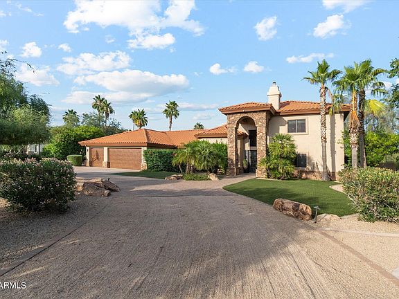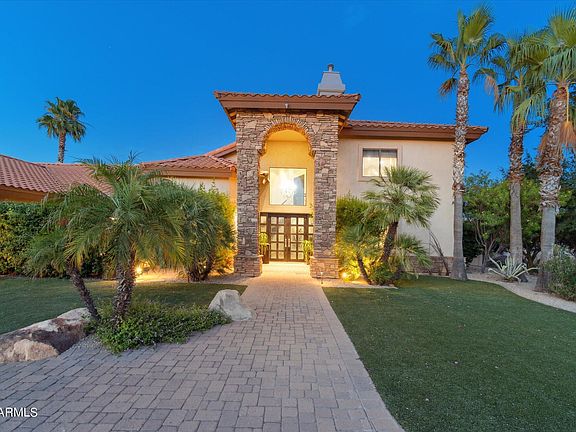 SPECTACULAR CUSTOM ESTATE on one of the largest lots in the Cactus Corridor with AMAZING MOUNTAIN VIEWS! Behind the custom iron doors, this Mediterranean home blends traditional and modern elements throughout. The main house is 3,700 SF with 4 beds and 3.5 baths. A detached casita sits approx. 90 ft from the main house and features a rooftop deck and desert botanical garden with its own private driveway accessed through an electronic gate. Guest quarters include 1,032 SF 2bed/1bath with an open concept living room/kitchen, walk-in closet & washer/dryer. Perfect Generational Living! DREAM BACKYARD OASIS w/a beach-entry pool, oversized spa for 8, perfectly placed Canary Island Palm, large turf areas for running & playing, fruit trees mature landscaping. The HUGE COVERED OUTDOOR LIVING is perfect for entertainment: complete with misters, speaker system and grilling area. INSIDE you will find a gorgeous remodeled kitchen, that is light and bright with 14' ceilings, white oak flooring, double ovens + warming drawer, oversized Fridge and Freezer, induction cooktop, large island, separate service area w additional sink and storage. The kitchen opens to a family room that has 20' foot ceilings, gas fireplace, & built-in banquette with pull-out ottomans. The 3 bedrooms 2.5 baths downstairs are updated and new carpeting. Up a grand curved staircase lies the 900sf primary suite with spectacular views of the majestic McDowell mountains. Custom mahogany cabinetry and platform bed, art niche w dramatic backlit onyx wall creates a sumptuous retreat. The spa-like bathroom has separate vanities, steam shower, 100 gal jetted tub, and a gas fireplace for the ultimate lounging experience. Off the master bedroom is the upper deck that runs the length of the home, affording the ultimate get-away space to relax and retreat. Interior paint inside and out, and NEW roof in 2020 with transferable warranty. No HOA, close to BASIS, Cheyanne and A+ rated schools, as well as shopping, hiking, biking, golf & under 30 mins to Sky Harbor airport. Enjoy the privacy and luxury this resort-like property affords.