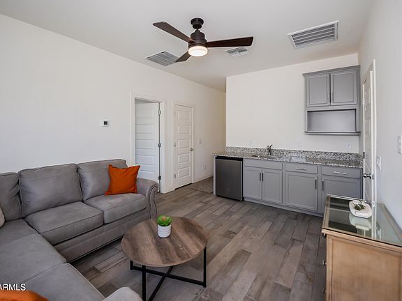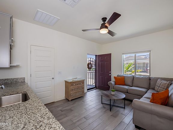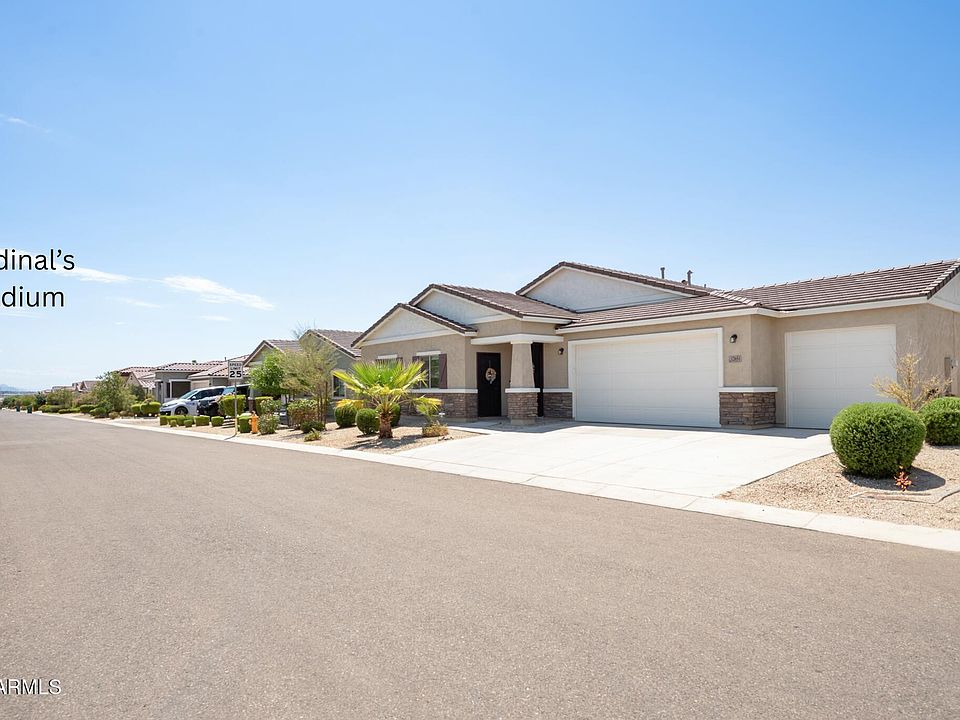 New construction home with a private in-law suite featuring its own entrance. Perfect for multi-generational living or a home office. The split floor plan offers two more guest rooms and a full bath down a separate hallway, while the spacious primary suite sits quietly at the back. Enjoy an oversized pantry/laundry room combo, and a backyard oasis with turf, pavers, pergola, and a view of Cardinals Stadium. Just a few miles from Westgate, Topgolf, the Wigwam Golf Club, and more. This location and layout make this home a must-see!