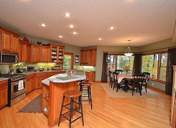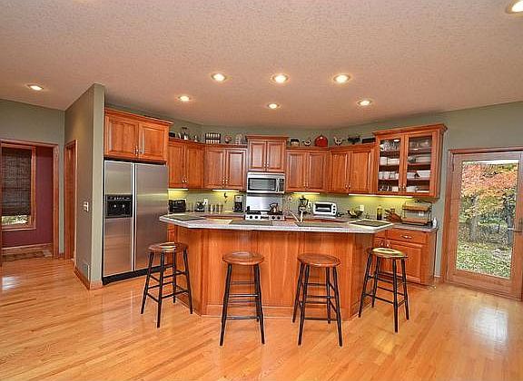 Cherry cabinets and trim throughout main floor; jacuzzi w/ceramic decking, french doors to master bedroom, in-floor radiant heating and wet bar w/ ceramic flooring in lower level. Impeccable home and yard. In-ground sprinkler. Private walking trails