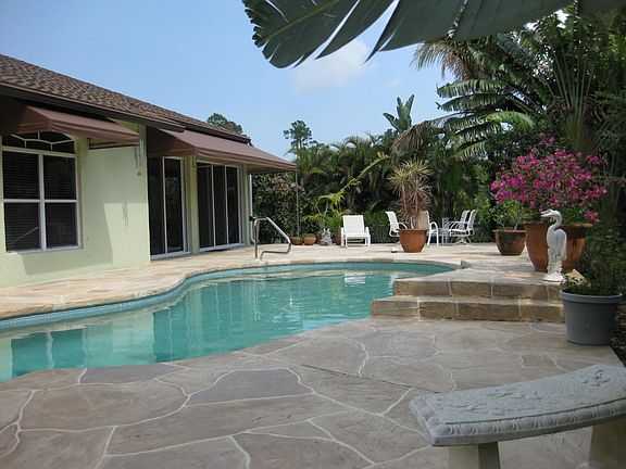 Pride of Ownership is obvious. Beautiful 3 Bedroom/2 Bathroom CBS Pool home. Magnificent Pool Area. Large master bath with walk in shower and Roman Tub. Two walk-in Closets. Granite Counter Tops in Kitchen. Florida Room is air conditioned with all sliding doors. Large detached 2 Car Garage with high door for boat or RV. Two stalls with Tack Room and Porch could be converted to Large Workshop. Large shed also. Air conditioner is still under warranty with assumable maintenance contract. Assumable Roof maintenance contract also. Water system has been re-bedded. RO unit in kitchen. Landscaped 1.25 acres with fruit bearing trees.