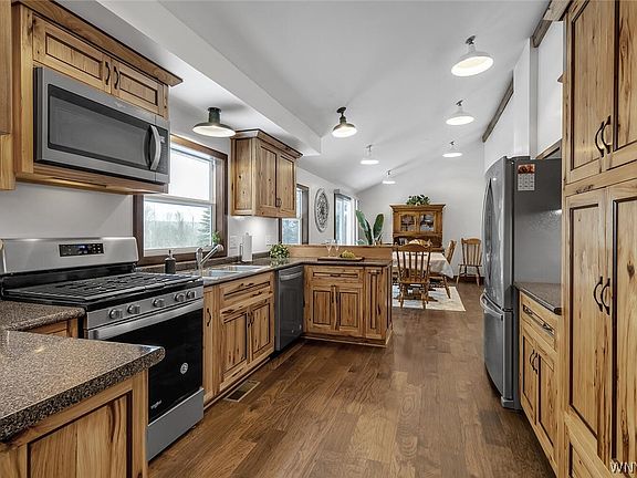 - Breakfast Bar, Cathedral Ceiling(s), Separate/Formal Dining Room, Eat-in Kitchen, Separate/Formal Living Room, Country Kitchen, Living/Dining Room, Sliding Glass Door(s), Natural Woodwork, Bedroom on Main Level, Main Level Primary, Primary Suite, Programmable Thermostat, Workshop