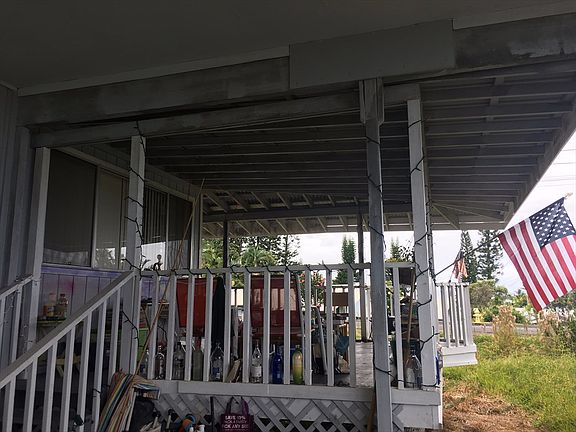 Ocean horizon and mountain views from the open lanai area, mountain views from the living room, covered deck off master. Features include double wall construction, a 360 square foot lanai, carport, and a separate laundry and storage area. This home has deferred maintenance on the interior and is an opportunity for the investor or family who appreciates location and potential. Home is owner occupied and is subject to court approval. No entry possible.