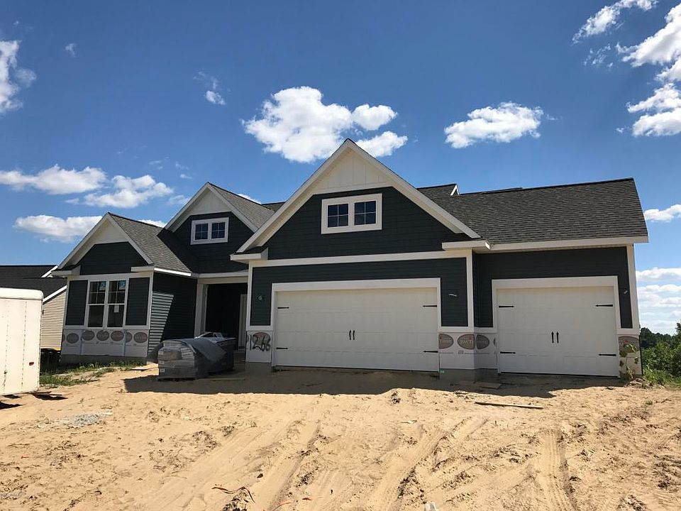 Welcome to the Manistee plan by Jim Tibbe homes. This Executive ranch home has a large great room w fireplace, dining area, Gorgeous kitchen w painted cabinets, quartz counters, tile backsplash, walk-in pantry and center island. Laundry room w linen closet, half bath, and mudroom w coat closet and bench with cubbies is off from the large three stall garage. Premium Vinyl Plank flooring at kitchen, dining, mudroom and foyer, master bedroom with trey ceiling, walk-in closet, master bath with a corner double sink vanity and tile shower is a relaxing retreat. Two additional bright bedrooms and full bath w/double sink vanity finishes the main floor. A finished rec room at walkout basement and 16x10 deck w/stairs to the backyard make for a great outdoor entertaining area, overlooking the park.