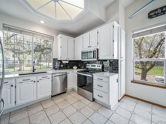 This stunning ranch style home with finished walkout basement is spacious and offers thoughtful updates, inviting living spaces, and room for everyone! The heart of the main level is the stylish eat-in kitchen, featuring a large window overlooking the cul-de-sac, white cabinetry and quartz counters, a dramatic black tile backsplash, stainless steel appliances (all included) and lots of windows. Warm neutral luxury vinyl plank flooring flows throughout the main living area, highlighted by a cozy gas fireplace and patio doors that open to a generous deck—perfect for soaking in the fresh Colorado air. Host gatherings in the large dining room brightened by a classic chandelier. The primary suite is a retreat in itself, boasting vaulted ceilings, a wall of windows, and a luxurious en suite bathroom complete with an oval soaking tub and separate shower, double sinks, and a spacious walk-in closet. The main level also features two secondary bedrooms, including one perfect for a home office, plus a full bath. Tackle laundry day with ease in the main floor laundry room with built-in storage, washer and dryer are included! The finished walkout basement is a true bonus with two additional bedrooms, a full bathroom, and a welcoming family room featuring another gas fireplace surrounded by stone, built-in shelving, and integrated speakers. A mini-kitchen with a sink, refrigerator, and parquet flooring makes the lower level ideal for multi-generational living or guests. A private corner lot makes an ideal outdoor retreat, and is fully fenced for any furry loved ones. The center of the community is just across the street, with an outdoor pool, a year-round indoor saltwater pool, a fitness center, a playground, and tennis courts! Whether you're looking for flexible space, a comfortable layout, or great indoor-outdoor flow—this home checks all the boxes. Don’t miss your chance to make it yours!