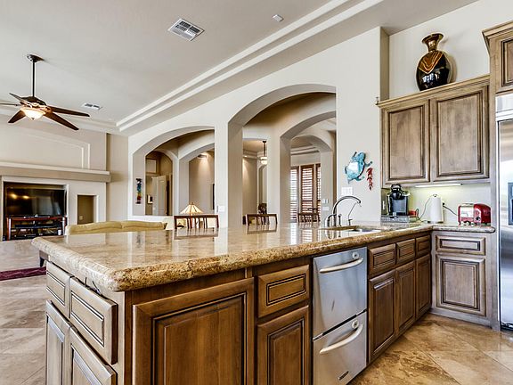Honey stop the car, this is it! Custom 5 bedroom + den Basement home! Lots of light & living space throughout home. Located on oversized cul-de- sac lot with RV parking & private front patio with waterfall. Stunning vibrant interior with a great split floorplan. Travertine in the right places & wood shutters throughout. Kitchen features staggered Alderwood cabinets, crown molding, SS appliances, wall oven, built in gas cooktop with vent hood, granite countertop, center island with own chef sink, & huge walk in pantry. Open to large family room with 12 ft soaring ceilings! Roomy den plus Exercise/Bonus room is approx. 20x20! This room not reflected in sq ft so home is closer to 4900sf per builder''s plan. Splash! Salt Water play pool with waterfall plus over 1000sf of extended covered patio!
