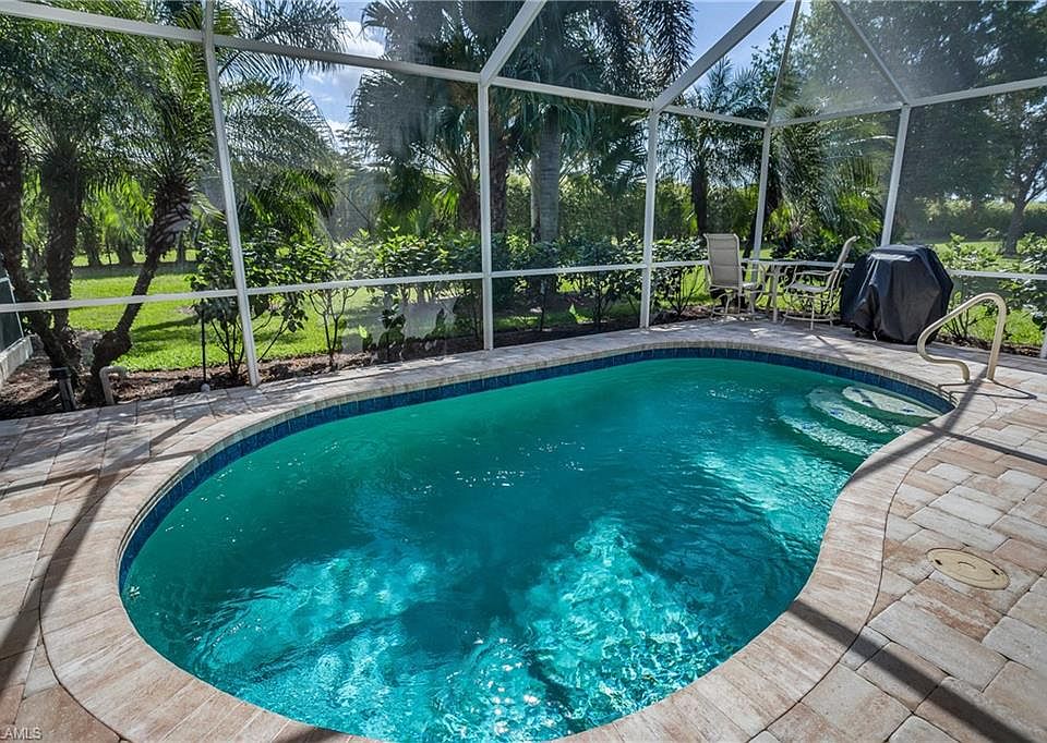 Wow! You better hurry! This Rare 2B+Den Pool Home in Stoneybrook won't last long! This maintenance free Villa is move-in ready & is one of the very few (only 4 in the community!) w a wonderful custom heated, saltwater pool w color changing LED lights, brick pavered lanai & a very private lush yard with beautiful landscape lighting illuminating multiple palms thru out the property. Wonderfully Updated kitchen w stainless appliances, tiled backsplash & kick panel at breakfast bar, pull out Pan drawers, updated hardware & a large pantry. Updated AC & Hot Wtr Htr, new W/D, Leaded Glass front door & screened entry, Plantation Shutters thru out, Tiled living areas & Bamboo wood flooring in the bedrooms. Great open floor plan w a spacious great room, open den & private guest bedroom. Full 2 Car garage with prewire for generator. The low HOA fees ($1,168/Q) cover Cable, Internet, Lawncare, exterior painting & roof cleaning. Stoneybrook Gateway has LOW HOA fees w/outstanding amenities: full clubhouse with pool, spa, fitness center, tennis, basketball, volleyball, playground, inline skating & a manned guard gate. Just minutes to SWFL Int'l, shopping, dining, Spring training games & more!