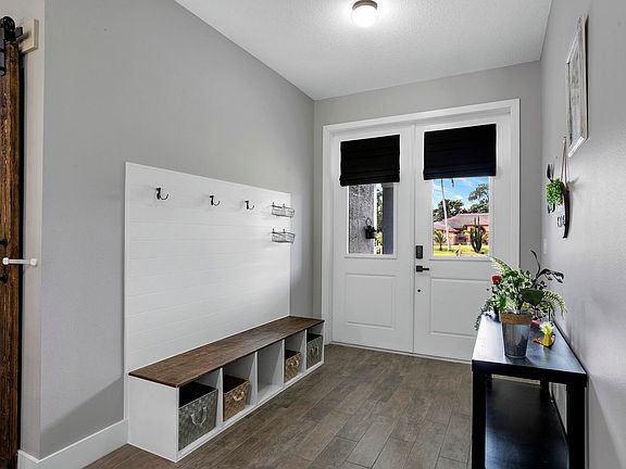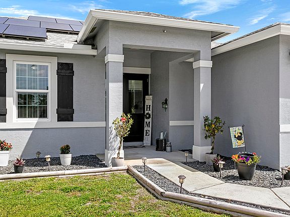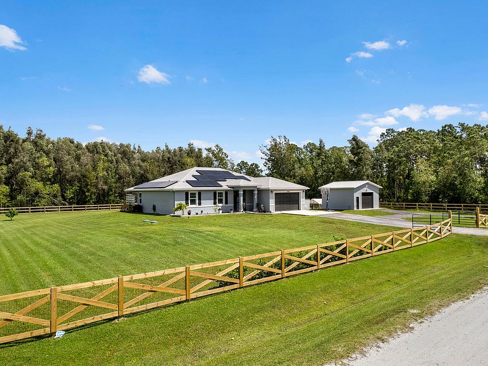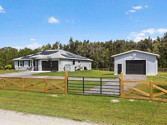 Exquisite 2021 custom built CBS 4 bed, 2 bath, 2 car garage with a detached 24 x 20 detached garage/workshop. Situated on 1.29 acre fully fenced canal back lot. Complete hurricane impact windows and doors.. Tons of upgrades in this beautiful home, soon to call your own. Walk in through double door entry into foyer area with custom built coat/cubby storage for your backpacks and shoes.. All wood tile floors throughout with 5'' baseboards. Kitchen features quartz counter tops, 42'' white wood cabinets, island with additional storage, vented hood, decorative backsplash and a custom built barn door for pantry. Interior laundry room w/cabinetry and folding table over front load W/D. open concept floor plan great for entertaining. Master bedroom with his and hers walk in closets, master bath with dual sinks , vanity and separate soaking tub. Three additional bedrooms, two with walk in closets. Guest bath has dual sinks. Double doors lead to covered patio with decorative wall planter and overlooks pool and spacious backyard with NO pond. Garage even features an EV charging station if desired. Detached garage has a separate 60 AMP panel to accommodate 110/220 power, if WiFi compatable, shelving,mini split cooling system, great for storing all your "toys" and makes for a great workshop or separate office. Main gate if electric, also gates for detached garage and for access to back canal area. There is also electrical outlets on the fence! Zoned irrigation system with fertilization infector. 400 AMP w/smart meter for solar panels, average electric bill is $30/month. Wiring has been installed for future in ground pool installation. Home is wired for generator and has covered storage area for generator. 4 security camera installed but capable of handling up to 8 cameras. There are also motion sensor lights for additional security. Great central Acreage location with easy access to Northlake or Okeechobee for commuting. Close to shopping, great restaurants, library, schools and parks. The Acreage is a growing community with many additional amenities coming soon!