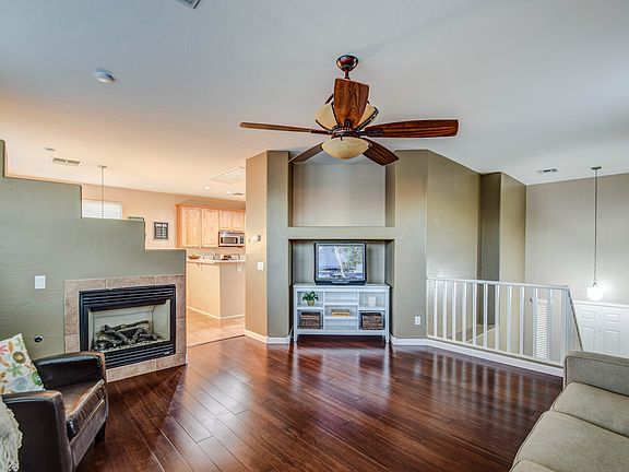 Welcome home! Beautiful two bedroom, two and a half bath home in Spectrum. Two separate living spaces with bedrooms- one on each floor! Upstairs you'll find a family room with fireplace, the kitchen and nook, a half bath and the master suite. The master suite has an en-suite bathroom with separate tub and shower, double sinks and large walk in closet. Downstairs you'll find another living space, the second bedroom and full bath. Private backyard with garden, fruit trees, serene water feature and more. All of this on a corner homesite directly across the street from one of many community play areas!