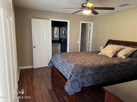 Quit Palm Bay neighborhood ready to call home! This lovingly cared for 3 bedroom 2 bathroom home is perfect for a first time home buyer. With a large back yard and screened in large porch, you can enjoy being outdoors and entertaining. Tile and laminate throughout. Comes with a home warranty!