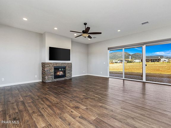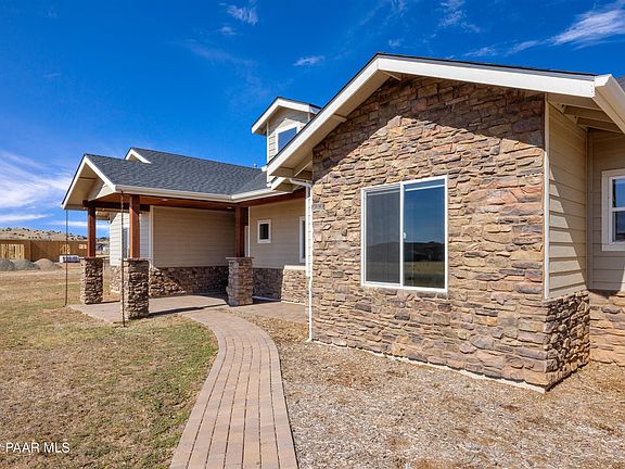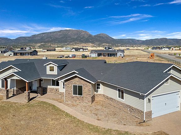 Beautiful home on 2 acres in Saddle View. New privacy screen at back fence. Huge kitchen w/ massive island for families and entertaining. Walk in pantry plus plenty of other storage. Large great room with rock gas fireplace. All new carpeting in bedrooms and freshly painted inside. Spacious master suite with access to back patio, his and her vanities in the master bath and huge walk in closet. 2nd guest room has its own onsuite bath and the 3rd bath is convienently located next to the 3rd bedroom. Private baths for everyone! Optional 4th bedroom can be used as a den/office or hobby room. The huge paved back patio is perfect for taking in the majestic views of Mingus Mountain. Back yard is already fenced and ready for your landscaping. Enjoy country living at its best.