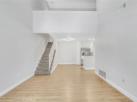 Beautiful 2 bed/ 2 bath condo located in a secured, guarded gated community! As you first step in the front door you will immediately notice the open floor plan and cathedral ceilings. The main floor includes a remodeled kitchen, full bath, walk-in pantry/utility closet, stackable washer/ dryer, spacious bedroom with closet organizer. The kitchen features quartz countertops, pantry, recessed lighting, built in spice rack and plenty of storage. Upstairs features a 2nd bedroom/ loft/ office with high ceilings. The ensuite walk-in closet includes a built-in organizer that leads to the private 1/2 bathroom. The community offers outstanding amenities: greenbelt garden, guard gated community, swimming pools, lots of parking spaces and 1 assigned carport and decals for parking. HOA pays for trash, exterior community yard maintenance. Conveniently located near shopping, restaurants, public transportation and the 22 freeway. Minutes away from Disneyland, Adventure City, Knotts Berry Farm, beaches and Rodeo public market.