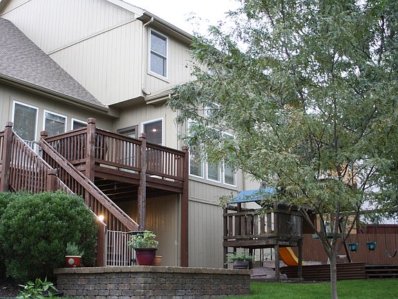 This stunning two story home with a walk out basement has a beautiful open concept floor plan with lots of natural lighting. The spacious kitchen has plenty of cabinets, a large island and pantry and leads right out to the deck which makes it perfect for entertaining. The living room has a beautiful fireplace with double mantle and vaulted ceilings. All bedrooms and laundry room are located upstairs and have large walk in closets and tall ceilings. You'll be thrilled to see how deep the 3rd car tandem garage is for all your extra storage needs. You will be sure to be impressed by the detailed landscaping along with in ground automated sprinklers and a fenced in back yard and playground area. The house has a brand new dual zone heating and air conditioner system. Located on a cul de sac on a prime corner lot in a popular neighborhood within walking distance to Forest View Elementary, Mission Trail Middle School, and Olathe West High School, this home is sure to sell fast! Agents welcomed, serious buyers only.