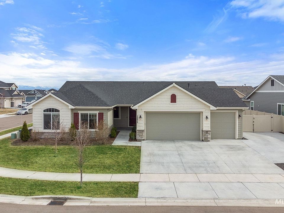 Discover this beautifully maintained 3-bedroom, 2-bathroom home with an office. The island kitchen is a chef’s dream, featuring an island with breakfast bar, built-in gas range, stainless steel appliances, and a spacious pantry. Flowing seamlessly into the expansive great room and dining area, you'll find a cozy corner fireplace with a striking rock surround. The master suite is a true retreat, boasting dual vanities and a luxurious walk-in shower as well as a massive walk in closet. Situated on a large corner lot and one of the biggest home sites in the neighborhood! This property offers a 3-car garage, RV parking on the side, and a generous covered patio in the backyard, perfect for relaxing or entertaining guests. Located in South Nampa, just minutes from Lake Lowell, this home has it all!