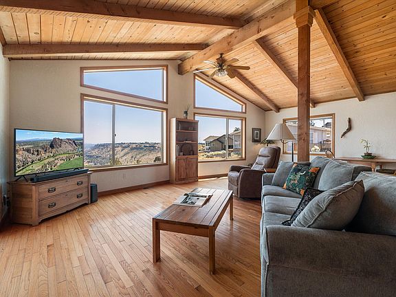 Come see this beautiful home on the Rim in Crooked River Ranch with stunning views. Rim homes that are not on a main road, rarely come on the market. This gem has been lovingly cared for and improvements have been made over the years- in July '23 new roof, gutters, windows and paint. Picture windows fill the prow front wall in the great room two feet above the hardwood floors up to the vaulted pine-lined ceiling. The large-timbered, great room and a cozy fireplace complete the spacious living area. Three NEW Sliding glass doors off decks two flank the great room for easy access to outdoor grilling & entertaining. A huge, fenced lawn area with Austrian pines, Bing cherry, apple & pear trees, create a park-like setting. Timed underground sprinklers in the front and rear have tracer lines and high-quality 1¼ inch sprinkler pipe. Don't miss out on this home where you'll enjoy extensive canyon views including Smith Rock!