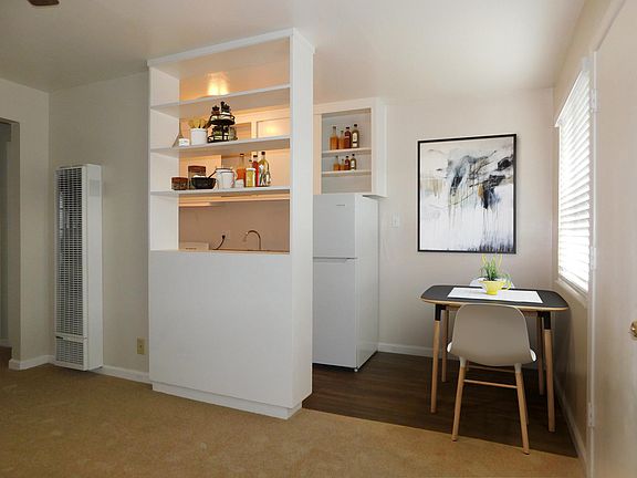 You enter into the common area/living room and to the right a 5x5 dinette area with efficiency galley wall kitchen divided back to living room with a shelved room divider: next door 4-piece bathroom, large bedroom area with 2 large closets: ample space for queen size bed/dresser/office desk. (Max 2 people) Non-Smoking Building, No Pets, $45/utilities