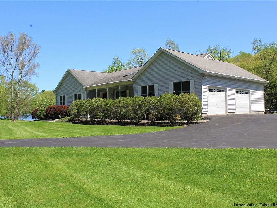 OPEN HOUSE SUNDAY JUNE 2nd from 12:00 - 3:00 pm! This is what brings buyers to the magic of the Hudson River Valley. First time on the market, show them a perfect home for weekends and vacations or full-time family dwelling. Built by present owners in 2002 with ample frontage on the Rondout Creek, this 3-bedroom, 2-bath ranch has a sweeping front lawn with pond, creek and private launch behind. River frontage is so hard to find with significant acreage at a reasonable price, and here you have it. The long driveway sets the house well off this country road, and buyers will walk up the steps to the long, rocking-chair front porch, a perfect sitting area to watch wildlife at your own pond. Enter the foyer and find yourself in a modern, bright house designed for style and efficiency. The open kitchen has hardwood floors, granite counter-tops and energy star appliances. Prep your meals in full view of guests sitting before the living room fireplace or helping to set the dining room table. The vaulted ceiling and skylights add a sense of light and space. 2 bedrooms are now used as office and craft rooms, while the master, with its walk-in closet and private bath, has glass sliders in view of the deck and creek beyond. A wood paneled sun-room off the living room faces the water and makes a perfect place for morning coffee and contemplation of nature. Eagles and swans are not unusual to see. Step out to the deck with seating area and heated swimming pool recessed seamlessly into the deck. Barbecue , swim, watch kayakers paddle by! There are 2 miles of navigable waterway from here, and owners have used it for a motor boat, kayaking and fishing for small-mouth bass. There is an attached 3-car (2-bay) garage with buffed concrete floors and plenty of storage space or an excellent work area. This home was built with careful attention to small details, maintained with pride and will be sought after by new owners who appreciate the love that went into it and the beauty of abundant surrounding nature.
