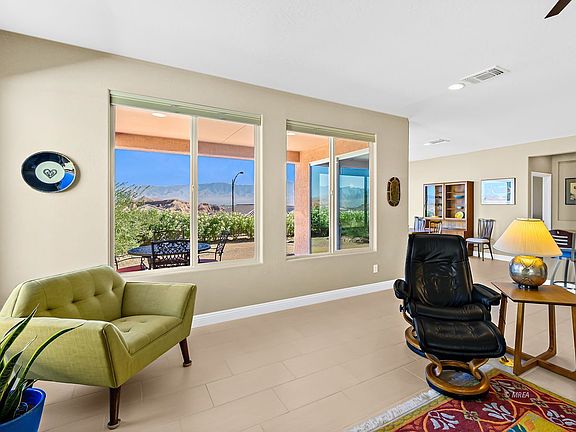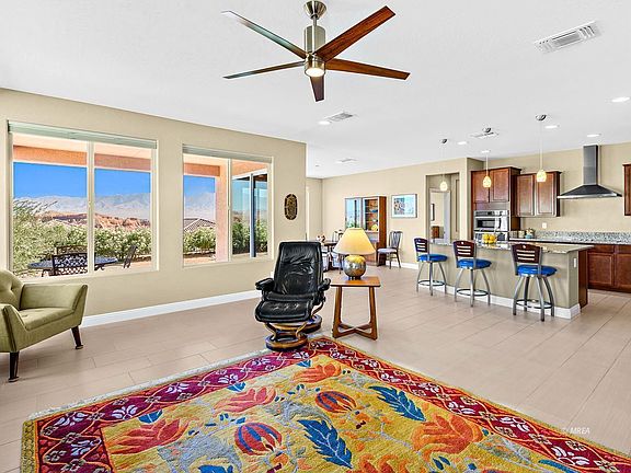 Beautiful Sanctuary model home in Sun City Mesquite - high up in Horseshoe Pass - just a short walk to the Recreation Center. Eastern Mountain views from the elevated home site - beautiful morning sunrises and lovely afternoon shade on the covered back patio. Pavers on the driveway and walkway add a classic touch to the front of the home. A popular floor plan - Open and Bright with designer 2 tone paint and gorgeous ceiling fans throughout. Dream kitchen with undercabinet lighting. Upgraded Tile in all of the main living areas and pricey granite counter tops in the kitchen and bathrooms. Upscale fixtures and extra lighting add charm. The 2 bedrooms are on opposite ends of the home - the hall bath is right next to the guest room - great for privacy when you have company. Master bedroom is huge with a lovely bay window that adds sunshine and VIEWS. Ensuite master bath has a NO threshhold tiled shower with glass enclosure and bench, granite counters and dual sinks, plus a huge walk in closet. The den was an added option that is great for an office and large enough for to add a Hideaway couch or Wall Bed. Extended garage has finished walls and insulation - and a utility sink.