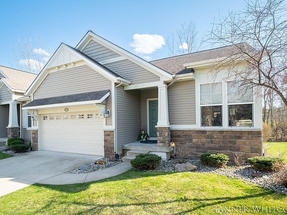 Looking for a peaceful place to call home? This beautifully maintained Byron Center condo was built in 2015 with 2 bedrooms, 2.5 bathrooms. A 3rd bedroom is possible by adding a door and small closet in the office. Spacious floorplan features a large primary bedroom w/ ensuite, and kitchen with granite counters, large island, pantry and SS appliances. The finished daylight basement offers loads of storage, a bathroom, bedroom, and large living room w/ gas log fireplace. Enjoy year-round comfort in the 4-seasons room off the kitchen, leading to a deck with private wooded views. 2-stall attached garage. Located in a vibrant community (The Woods at Carlisle Crossings) with an association pool, pickleball courts, walking trails and more!