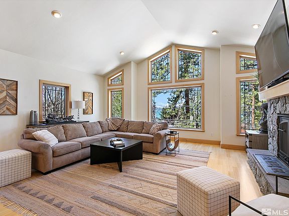 Nestled just a stone's throw away from the shores of Lake Tahoe, this mountain-style retreat embodies luxury living at its finest. Built in 2005 by the meticulous hands of its past owner/contractor, this picturesque abode boasts over 3,000 square feet of meticulously crafted space., Upon entering the upstairs great room, you will be greeted by a breathtaking great room adorned with a soaring open beam vaulted ceiling. With westerly exposure, sunlight floods the room through vast picture windows, offering filtered views of year round sunsets and the serene lake beyond. A magnificent rock fireplace stands as the centerpiece of the room, exuding warmth and charm with its timeless finishes. The main level is graced by a spacious master bedroom suite, providing a sanctuary of comfort and relaxation. The well-appointed kitchen is a culinary delight, featuring red birch craftsman-style cabinetry and top-of-the-line Thermador & GE Profile stainless steel appliances. For entertainment, a separate family/media room beckons with its cozy fireplace, creating an inviting space. No detail has been overlooked in this home, with in-floor radiant heating, smart home controls, a cedar-wrapped exterior, extensive lighting controls, an alarm system, and a central vacuum system all seamlessly integrated into the property. Step outside to the backyard oasis that includes a fenced yard a paver patio and a fire pit with a low-maintenance yard perfect for outdoor enjoyment and relaxation. Situated in the Lincoln Park Estates neighborhood, this property offers convenient access to three designated beach easement entries, allowing residents to easily enjoy the pristine waters of Lake Tahoe. In addition, Douglas County offers seasonal boat moorings for the residents. Just minutes away, the Cave Rock boat ramp and beach beckon for aquatic adventures, while the excitement of Stateline Casinos and Heavenly's Gondola is a mere 5-mile drive away. This lakefront neighborhood haven is a rare gem that seamlessly blends modern luxury with the timeless beauty of Lake Tahoe, offering a lifestyle of unparalleled elegance and comfort in the heart of nature's paradise.