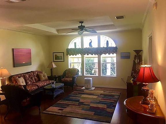 You will fall in love with this home! 2 bed 2 bath with a den,1568 sqft. The home comes fully furnished, move in ready! Just bring your toothbrush, clothing and golf cart! Smooth ceiling with a tray ceiling in the living room, crown molding throughout and drywall. Wood laminate flooring and tile flooring, plenty of cabinets, storage, walk in closets and a pantry. Beautifully landscaped yard with St. Augustine grass. Backyard includes a hedge for your privacy.