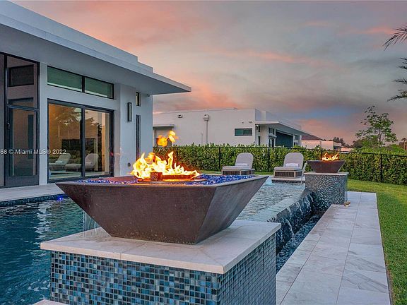 The Perfect Modern Masterpiece! Stunning gated Oak Park home 5/5.5 plus an office features high-end upgrades. Kitchen equipped w/ Sub-Zero column refrigerator, freezer, & wine refrigerator, as well as 2 under counter refrigerators & built-in Miele coffee/cappuccino maker. Rooms feature designer automated blinds on windows & upgrade fixtures in all en suites. Oversized primary suite w/ large sitting area, patio access, his & her closets with built-in cabinetry & lighting, & separate water closet featuring Toto. Enjoy outdoor living in the designer saltwater pool & spa w/fire feature powered by gas, summer kitchen w/automated phantom screen, & in ground anti-insect misting system. Feel secure in your home w/all impact windows & doors along w/ 1,000 gallon whole home generator and much more.
