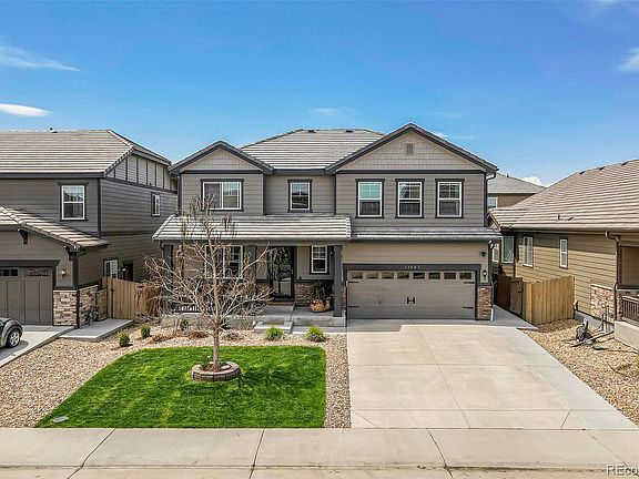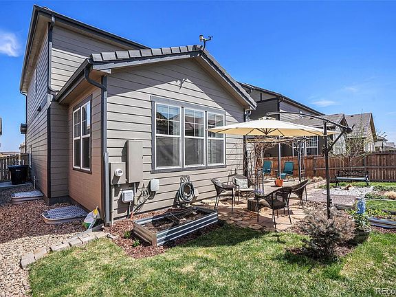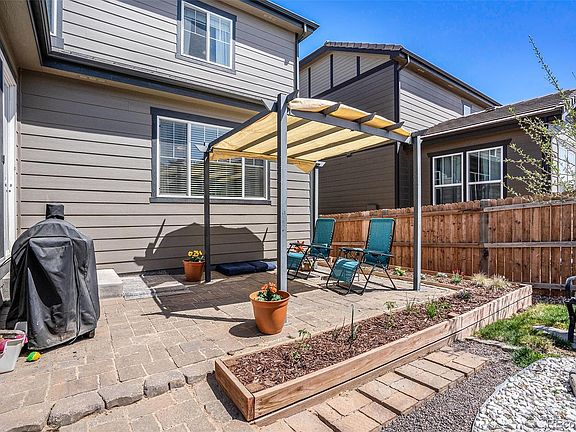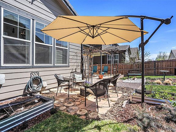 SELLER SAYS "MAKE US AN OFFER!!" This beautiful Richmond America home was built in 2017 and has been lovingly maintained by the owners who had some wonderful features added. The bump out dining room was an addition they insisted on when the home was built, giving them more room for entertaining family & friends, plus adding more square footage in the basement. When walking in the front door, the room immediately on your left that could be used as: an office, a formal living room, a kid's play area.....you decide! The rest of the main level is an open concept area with family room/kitchen/dining room, and opens to the charming back yard that you will think was professionally designed. It features a great dining space, garden area, a trellised grape vine, a young plum tree, a pollinator garden, established raspberries, several Colorado native plants, as well as an amazing sitting area with a "tree stump" floor! The upper level of the home features 3 bedrooms & 2 bathrooms which include the primary suite, complete with a very large primary bathroom and walk-in closet. In the basement you'll find a large media room, an additional bedroom and a 3/4 bathroom. Notice the climbing wall in the basement bedroom. The grips are supported by extra studs behind the drywall, making them very secure! This home is close to Carpenter Park (2.2 miles), East Lake (1.1 miles), Trail Winds Rec Center: a new rec center with swimming, rock climbing, dog park, skate park, gym, classes, preschool, etc....(1 mile), Summer Moon Coffee (.3 miles), Adams County Fairgrounds that has firework shows you can watch, almost completely unobstructed, from the master bedroom windows (3 miles), Anythink Library, which has a great summer concert series (.9 miles). A walking trail connect the home to the local elementary and middle school, as well as East Lake and the N line....no need to walk on a streets with cars!