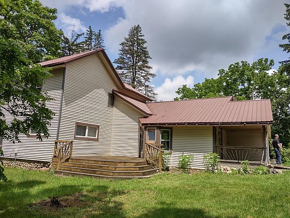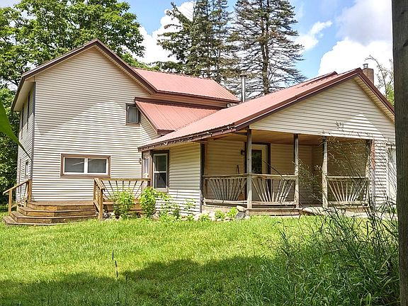 TRULY A GOLDEN OPPORTUNITY! Large farmhouse that sits on 7.8 acres! This spacious home features 4 bedrooms and 1 good sized main floor full bath, a very large kitchen and dining area, a huge, enclosed wrap around front porch, a covered deck off the back of home, an additional deck, a 3 stall detached garage and a huge shed in back. Updates include a newer metal roof, newer furnace and water heater, newer electrical box, newer well, replacement windows & vinyl siding. All appliances included. The home does need interior work/updating and plaster/drywall work in a couple of rooms. A great opportunity for some sweat equity! Home to be sold ''AS IS''. 1 year home warranty included. Seller to review any offers Wednesday 7/12 after 5pm.
