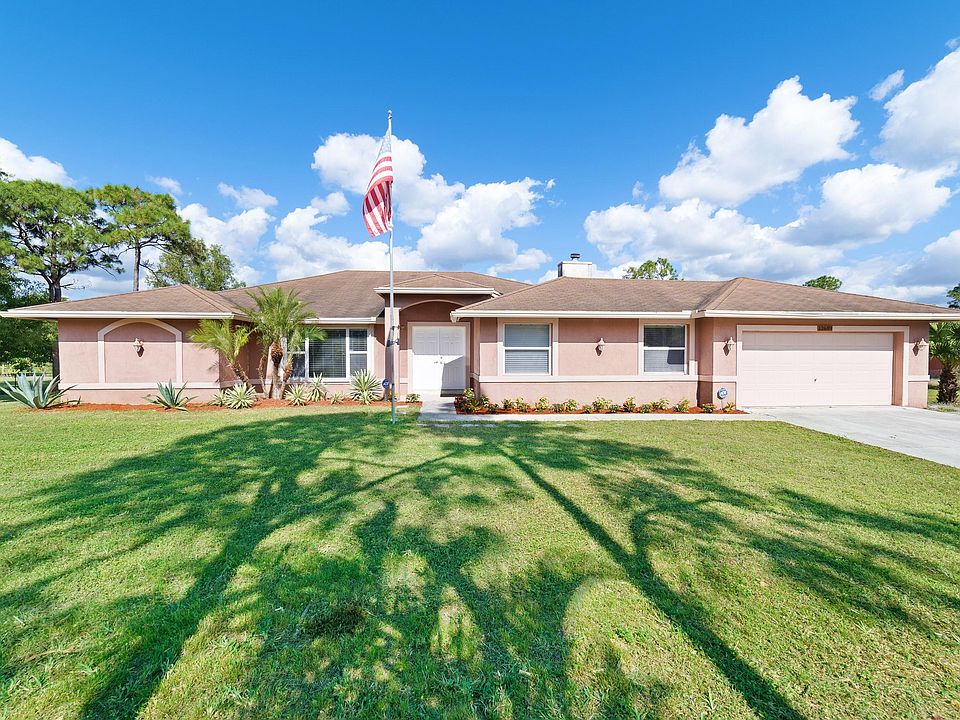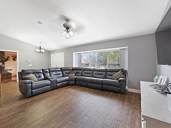 4 bed 2 bath home with bonus fireplace room nestled on 1.14 acres in a picturesque setting of mature trees & a beautiful yard with a fire-pit. Den/billiard room could be made to a 5th bedroom. Just needs a closet. This 2,509 sq ft. home is the ultimate oasis with a HUGE master suite! 2 car garage, open/large kitchen with updated appliances, large sink and granite countertops. Home also has wood plank tile floors, vaulted ceilings, security system, and a gorgeous back patio and backyard. A/C and well system are 2 years old and well pump was replaced 2 months ago. Windows let in lots of natural light. Close to parks, shopping, restaurants, & highway access. Bring boat and RV. Pond has a small dock. (Two Date Palms next to the driveway are excluded from sale)