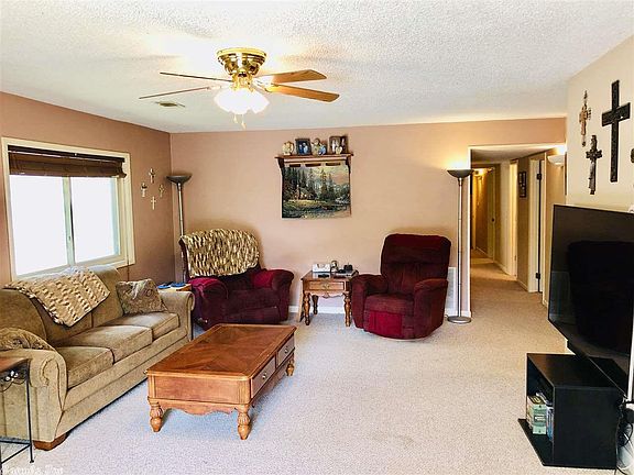 Your toes can be in the water within seconds! Single level on the main channel of Lake Catherine with an unobstructed lake view, including a stationary dock with lift. Watch the day go by from the patio or sunroom. 25x35 detached garage with 10' doors plus 2 car covered parking. Large living area with stone fireplace. 4 large bedrooms with 3.5 baths. Great potential for nightly rental! Pontoon boat and jet ski are negotiable. Sunroom not included in sq/ft. Roof 2012, HVAC 2014.