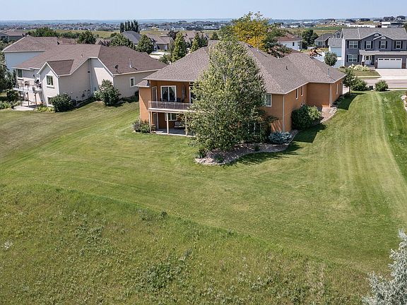 Welcome to this breathtaking Ranch style home located on a coulee, offering awe-inspiring views of the surrounding landscape. The primary bedroom is a true sanctuary, featuring a suite with a shower and a relaxing whirlpool tub, complemented by wrap-around windows that flood the space with natural daylight. Additionally, the suite boasts two separate sinks and a spacious walk-in closet with many built-ins for added convenience. Cherry hardwood floors grace the main living area and kitchen area, guiding you to the balcony that overlooks the picturesque coulee through oversized windows and doors. The main level features 14-foot ceilings, adding to the open and airy ambiance. A formal dining area offers a separate space for people to gather. You will find cherry cabinetry and trim throughout the house to further enhance the elegance. There are two additional bedrooms on the main level, alongside a full bath, providing ample space for all. Heading to the lower level, you'll find two more bedrooms, a spacious family room with plenty of room for recreation, and a dual-sided fireplace that adds a cozy touch. The walk-out basement leads to a patio area, perfect for outdoor entertainment and enjoyment of the scenic views. The exterior features stucco siding, adding to the durability and quality of the home. With a triple heated garage and an abundance of storage space in the lower level, this home combines luxury, comfort, and nature's beauty in a desirable North Bismarck location. Call an agent today for a private showing.
