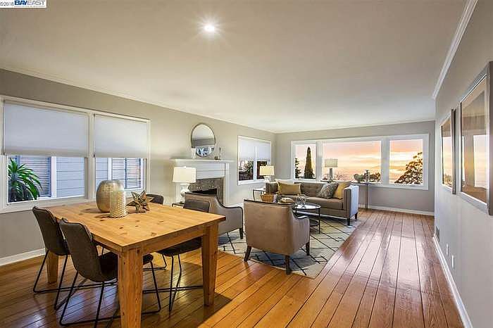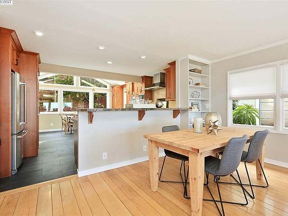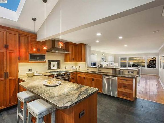 -Mid-century, single-level home featuring 3 bedrooms, 2 bathrooms, and approximately 1,410 square feet of living space. Built in 1951. -Enjoy sweeping views of the Bay, Golden Gate Bridge, and Berkeley Hills through expansive picture windows. -The chef's kitchen is outfitted with leather-finish granite countertops, a subway-tile backsplash, rich cherry cabinets, a six-burner gas range, stainless steel refrigerator, dishwasher, and built-in microwave. -A charming breakfast nook with a vaulted ceiling, a built-in window seat, and a bar counter offers seamless access to the backyard. -Spacious living and dining areas boast original hardwood floors, abundant natural light, and a vintage fireplace. -The beautifully landscaped rear garden features mature California native trees, lush greenery, large flower beds, and a wooden deck that overlooks the bay. -Includes a convenient laundry closet with washer and dryer. -Additional features include central heating and brand-new energy-efficient windows. -Attached two-car garage with ample storage space. -Freshly painted. -Nestled in the Berkeley Hills and surrounded by lush greenery, this home sits along scenic Grizzly Peak Boulevard, within minutes of Tilden Regional Park and Inspiration Point. -Tilden Park offers miles of hiking and mountain biking trails, picnic areas, the beloved Steam Train, historic Carousel, Grotto Rock, and the renowned UC Botanical Garden. -The home is just moments from Tilden Golf Course, Terrace View Park, and the Lawrence Hall of Science. -less than 10 minutes from UC Berkeley Campus, Downtown Berkeley, Gourmet Ghetto, Telegraph and Solano Avenue. -Easy drive (less than 3 miles) to North Berkeley and Downtown Berkeley BART stations. -Property includes a SimpliSafe security system; tenant may activate and pay the subscription if desired. Renter is responsible for water, garbage, gas, electric and internet. Owner pays for monthly yard care. No smoking allowed. Up to two pets total allowed, small dogs or cats. Property includes SimpliSafe security system; tenant may activate and pay the subscription if desired.
