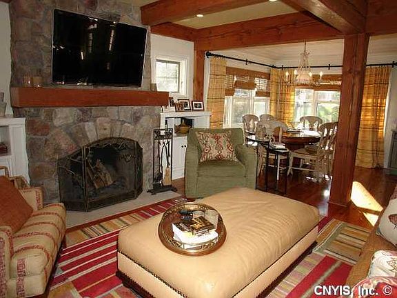 Built in 2005 this exceptional home offers 103' on Skaneateles Lake with an eye for detail. Custom cupboards, marble counter tops, GE Monogram appliances, reclaimed country pine floors & California beams, magnificent stone wood burning fireplaces w/custom made wood doors throughout, along with gorgeous bathrooms. Siding is Hardy Plank along with Stone & Vinyl shakes for easy maintenance. Enjoy the hot tub w/waterfall on lower deck overlooking the Lake & fire pit plus permanent dock and storage house on the waterfront to complete this wonderful home plus 1 car detached garage with storage.